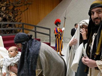 الفاتيكان- نبض الحياة- استقبل قداسة البابا فرنسيس صباح أمس السبت في قاعة بولس السادس بالفاتيكان شخصيات وعاملي المغارة الحيّة لبازيليك القديسة مريم الكبرى، حيث أشار في كلمته إلى أنّ البازيليك تحفظ على ذخيرة مهد يسوع، وبالتالي فهي ترتبط بشكل خاص ببيت لحم وبالمغارة.