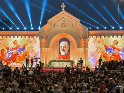وقال: "أطلب منه بإسمي وبإسمكم أن يمّن علينا هذا السلام العادل المرغوب، أن يعطينا هذه النعمة مثلما وعد. ولكنّي أريد الكثير والأكثر وأنا أمام جثمانه النقي أريد أن أخاطبه مباشرة بإسمي وبإسمكم سائلاً إيّاه: هل ترى هذا الجمهور الغفير الذي يحتفل بقدومك يا أبتي المفضال؟ هل تشعر بما يشعرون به لك من محبّة واكرام؟ أبتي الحبيب انظر إلينا، أنظر إلينا كيف نحن متلاحمين جنبًا إلى جنب وقلبًا إلى قلب، نصبو إلى السلام والعيش الكريم متماسكين بالقيم الإنسانية والأخلاقية والإجتماعية والروحيّة. انظر إلينا وباركنا بإسمه تعالى وحقّق لنا أمنيتنا لكي بنعمته نعود إلى ضمائرنا وننكب على واجبتنا الروحية والزمنية والوطنية، لبنان الكرامة لبنان الحرية. لبنان التآخي لبنان الرسالة. نعم يا آبتي، ها قد أتيت إلينا من المدينة المقدّسة لتشاركنا هذه الأزمة، لتعزّينا وتساندنا في هذه المرحلة ولتنظر بعيونك الأبدية إلى ضعفنا البشري وتقوي إرادتنا وتنوّر طريقنا وتحلّ مطالبنا بنعمة الإله الأزلي ونحن بدورنا نأخذ المبادرة للمصالحة مع ذاتنا واخوتنا، ومجتمعنا، نأخذ مبادرة المصالحة الوطنية والسياسية. ليعودَ وطننا لبنان إلى جماله وحبّه ورونقه مُرتديًا هيئته الدستورية ليكون له رئيسًا ودولة ومديرية وقضاء مبدأهم الخدمة والمحافظة على كيانَه بالمشاركة والمساواة".