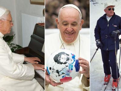 البابا يوحنا بولس الثاني يتزلّج، والبابا فرنسيس يحمل كرة قدم، والبابا بنديكتوس السادس عشر يعزف على البيانو