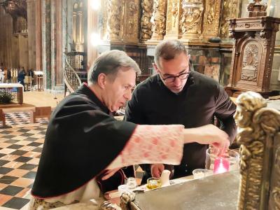 سنتياغو دي كومبوستيلا - اسبانيا - نبض الحياة - في إطار زيارته الرسمية إلى إسبانيا، واصل الأب بشار فواضله، كاهن رعية المسيح الفادي في الطيبة – رام الله، لقاءاته الرعوية والكنسية، حيث زار يوم أمس كاتدرائية سنتياغو دي كومبوستيلا، الواقعة في منطقة غاليسيا شمال غرب إسبانيا، والتقى برئيس الأساقفة المونسنيور فرانسيسكو خوسيه بريتو فرنانديز.