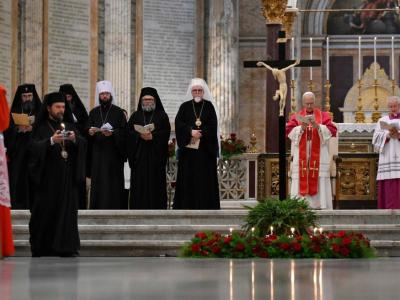 وللمناسبة ألقى الحبر الأعظم عظة استهلّها بكلمات الرسول بولس: "أما أنا فمعاذ الله أن أفتخر إلا بصليب ربنا يسوع المسيح"، وقال إنّ كلمات الرسول بولس، الذي نجتمع اليوم عند ضريحه، تُدخلنا في أجواء إحياء ذكرى شهداء وشهود الإيمان في القرن الحادي والعشرين، في عيد ارتفاع الصليب المقدّس. عند أقدام صليب المسيح، خلاصنا، الذي تصفه الليتورجيا بأنّه "رجاء المسيحيين" و"مجد الشهداء"، أحيّي ممثّلي الكنائس الأرثوذكسية والكنائس الشرقية القديمة والجماعات الكنسية والمنظّمات المسكونية، وأشكرهم على تلبية دعوتي للمشاركة في هذا الاحتفال. وإليكم جميعاً أوجّه عناقي؛ عناق سلام!