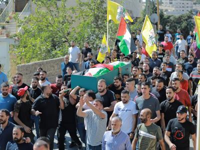 2023-10-13 أهالي قرية ديرجرير وقرى شرق رام الله يشيعون جثمان الشهيدة رندة عجاج التي ارتقت بعد إصابتها هي ونجلها برصاص الاحتلال خلال مرورهم بسيارة العائلة من المدخل الغربي لبلدة سلواد مساء الأمس. المصدر: راية اف ام.