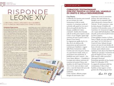 تطالع المجلة القرّاء بمقال افتتاحي بقلم البابا لاون الرابع عشر يتضمن رداً على سؤال طرحته على أسرة التحرير امرأة سويسرية في عقدها الخامس، تُدعى نونسيا، وتعمل كمعلمة تعليم مسيحي في إحدى المدارس وتقول إنها تسعى إلى زرع البذور، لكنها تواجه صعوبة في ذلك، لأن الفتيان والعائلات يفضلون انشغالات أخرى كالرياضة والموسيقى والهاتف الذكي والاحتفالات.