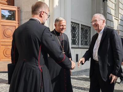 وفي بداية زيارته التقى أمين السر ممثلي السلطات الكنسية والمدنية في مدينة لفيف حيث توجه بعد ظهر الأمس إلى كوريا الأبرشية يرافقه السفير البابوي في أوكرانيا رئيس الأساقفة فيسفالداس كولبوكاس، وكان في استقباله المتروبوليت مييتشيسلاف موكرشيتسكي والأسقفان المعاونان إدوارد كافا وليون مالي. وشارك في اللقاء المطران فولودومير هروتسا أسقف لفيف المعاون للروم الكاثوليك كما وشهد اللقاء مشاركة رئيس الإدارة المحلية في المدينة ماكسيم كوشيتسكي وعمدة لفيف أندري سادوفي.