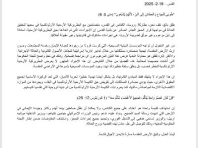 إن استهداف كنيسة واحدة هو اعتداء على جميع الكنائس، ولا يمكننا أن نظل صامتين بينما تهدم ركائز وجودنا الإيماني في الأرض التي شهدت رسالة السيد المسيح. وبناءً عليه، ندعو رئيس الوزراء الإسرائيلي بنيامين نتنياهو، ووزير الداخلية موشيه أربيل، والوزير تساحي هنغبي إلى التدخل الفوري، وتجميد جميع إجراءات الحجز، واستئناف المفاوضات ضمن إطار اللجنة الحكومية المعنية، وذلك للتوصل إلى حل عادل لهذه القضية بروح العدالة.