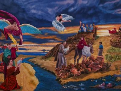 دمَجَ المبدع في لوحته أزمنة المنفى وعدم الاستقرار والعبور وظروفها، إذ تتقدم العائلة المقدسة في مشهد طبيعي يكتنفه العنف، تاركةً وراءها مجزرة الأبرياء، مستحضرةً مأساة تمتد عبر التاريخ.