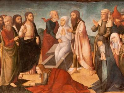 وبعد مرور أربعة أيّام على وفاته، انطلق المسيح مع تلاميذه إلى بيت عنيا، فلاقته مرتا وبدأت تعاتبه قائلة: «يا ربّ، لو كُنتَ ههنا لم يمت أخي» (يو 11: 21)، وبعدها تابعت: «لكنني واثقة بأنّ الله يعطيك كلّ ما تطلبه منه» (يو 11: 22)، فأجابها يسوع: «سيقوم أخوكِ» (يو 11: 23).