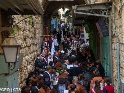 رافي غطّاس - آسي مينا - بين أزقّة القدس الخالية وعلى وقع صخب الحرب في غزة، انطلق نحو 500 طالبة وطالب مسيحي من مدارس القدس للمشاركة في رياضة درب الصليب على خُطى المسيح. هنا، في المكان ذاته الذي شهد قصة الحبّ العجيب قبل ألفي سنة، تضرّع الأطفال من أجل السلام في غزة وسائر الأراضي المقدسة.