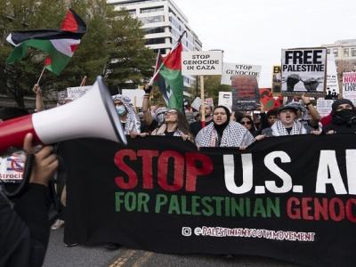 ونظم عشرات المواطنين المؤيدين لفلسطين تظاهرة منددة بالحرب على قطاع غزة، أمام منزل الرئيس الأمريكي جو بايدن في ولاية ديلاوير، حاملين الأعلام الفلسطينية ولافتات تدعو لوقف إطلاق النار.