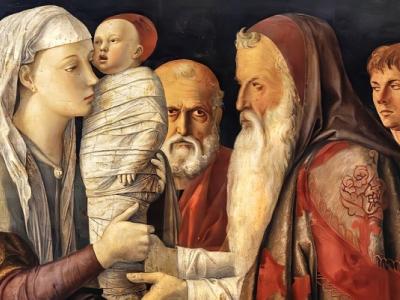 نَحْنُ فِي أَقْدَس مَكَان فِي القُدْس فِي ذَٰلِكَ ٱلزَّمَان، حَيْثُ يُقَدَّمُ يَسُوع لِإِتْمَام الشَّرِيعَة. يُبْرِزُ الإِنجِيلِيُّ طَاعَة مَرْيَم وَيُوسُف لِلتَّعْلِيمَات ٱلْمُتَعَلِّقَة بِوِلَادَة ٱلْبِكْر، ٱلَّذِي كَانَ يَجِب فِدَاؤُهُ مِنْ خِلَالِ تَقْدِيم ذَبِيحَة حَيَوَانِيَّة.