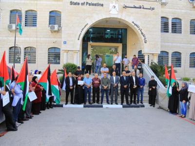 ورفع المشاركون شعارات منددة بجرائم الاحتلال المتواصلة التي تسببت بارتقاء آلاف الأطفال والنساء والمواطنين الفلسطينيين عموماً، واستهداف المدارس والجامعات والطلبة والكوادر التعليمية، مطالبين العالم الحر بمؤسساته الإنسانية والقانونية والأممية للتحرك الفوري لوقف جرائم الحرب التي يرتكبها الاحتلال.