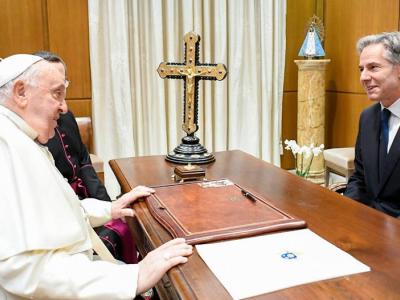 وكتب بلينكن على منصة "إكس"، مرفقًا صورًا للقاء، "التقيتُ اليوم البابا فرنسيس للتعبير عن امتناني لقيادته العالمية في حماية الفئات الأكثر ضعفًا وتعزيز الكرامة الإنسانيّة".