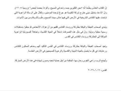 ويبدي أصحاب الغبطة والنيافة بطاركة ورؤساء الكنائس قلقهم من أن هؤلاء الأشخاص قد حظوا باستقبالات رسمية محلية ودولية. وإن في مثل هذه التصرفات تدخلاً في الحياة الكنسية، وتجاهلاً للمسؤولية الراعوية الموكلة إلى البطاركة ورؤساء الكنائس في القدس.